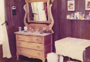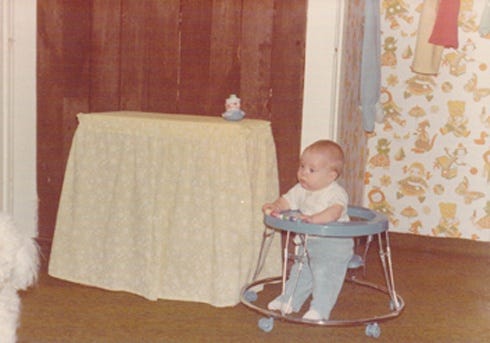 When I think about it now, it seems crazy, but Les got some of the wood from the old barn on his parents’ farm, and we put it on the walls of the baby’s room. We got a dresser that had been his dad’s when he was young. After I’d made some pregnancy tops, I made curtains, covered an old laundry hamper to match, and made a change table from an old table we found at a garage sale. We decorated the walls with some pictures I’d made plus one that had been my paternal grandmother’s. We did buy a new crib and sheets, a music-box mobile for the crib, and some clothes (neither pink or blue), and we were given baby clothes and toys by our family and friends.